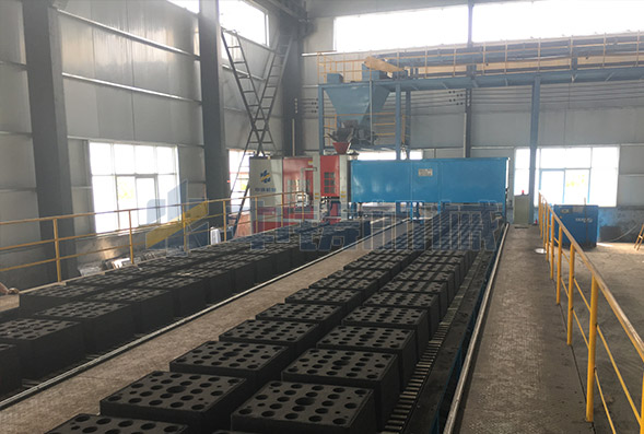1、全自動造型機打出來砂型直接在鏈板線上循環輸送,可以是單排雙列,也可以雙排雙列;
